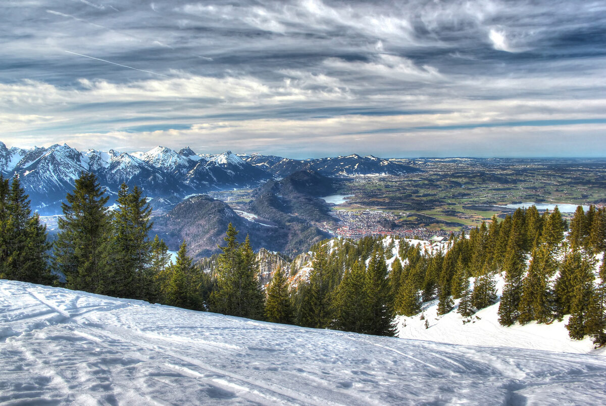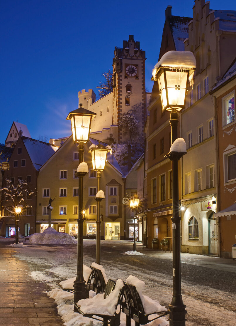 Winterurlaub in Füssen im Allgäu ist das beste Reiseziel für Wintergenießer. Die romantischen Straßen der Stadt laden ein, in den Geschäften, Restaurants und Cafés in der Füssener Altstadt zu entspannen.